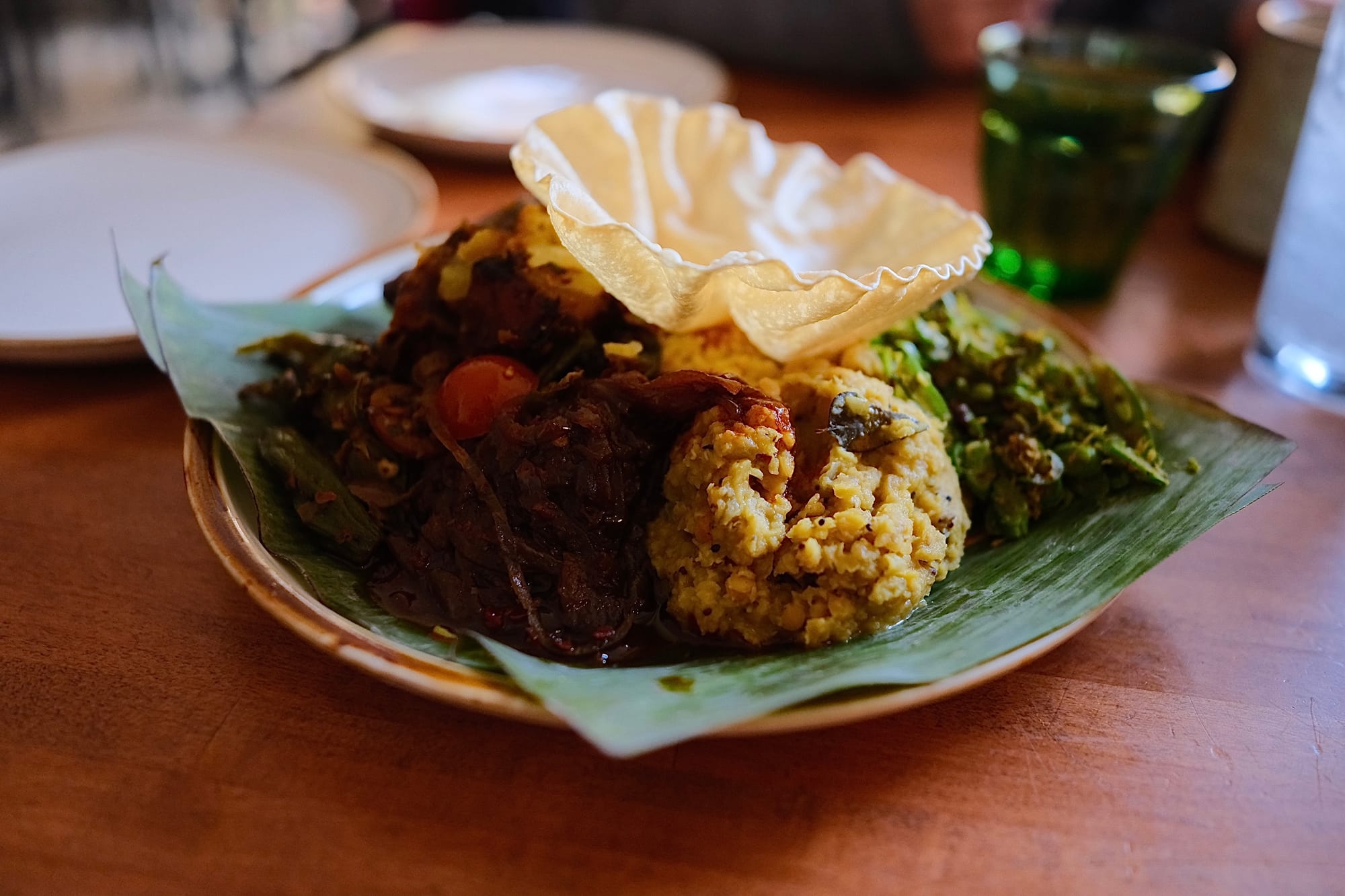 Today my wife and I celebrated 10 years since our first date, which was at a now-closed bar called Kask, which was a few blocks from my old apartment in the West End. Today we went to a Sri Lankan restarant called Mirisata. We shared their special, which consisted of Pumpkin Curry, Deviled Potatoes, Tempered Okra, and green Bean Mallum. I added on the Jaggery "Beef" Curry and she had a spiced cider. Everything was very good, but we both agreed that the vegan beef curry was the best.