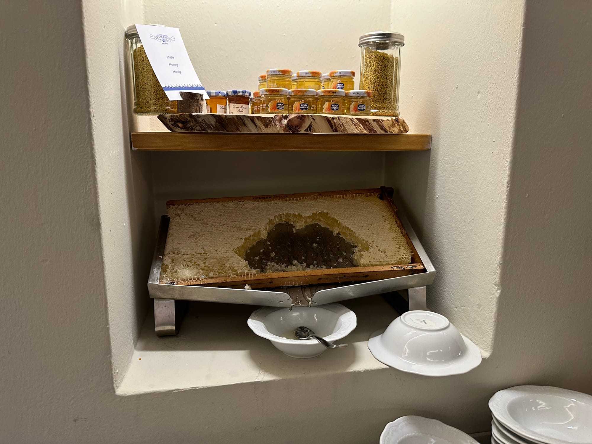 The room looked out on snow-capped peaks, and the breakfast spread was the kind you remember (and we still talk about it). Fresh fruit, eggs, pancetta, espresso made to order, and honey dripping from the comb.